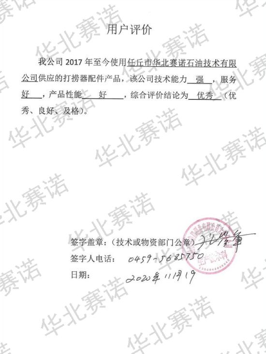 “熱情、誠信、準時”是我們的技術支持和售后服務的宗旨。“用戶至上、質量第一、響應及時”是我們的服務原則。我們是一只專業的科研團隊。擁有十分豐富的現場經驗和解決各種復雜的技術難題的能力。合作廠家廣泛?梢园凑沼脩粜枨笤O計加工出各種類型的機械產品。同時,為了更好的服務于石油鉆井及打撈,我們也在技術不斷創新,開拓更多專業領域。